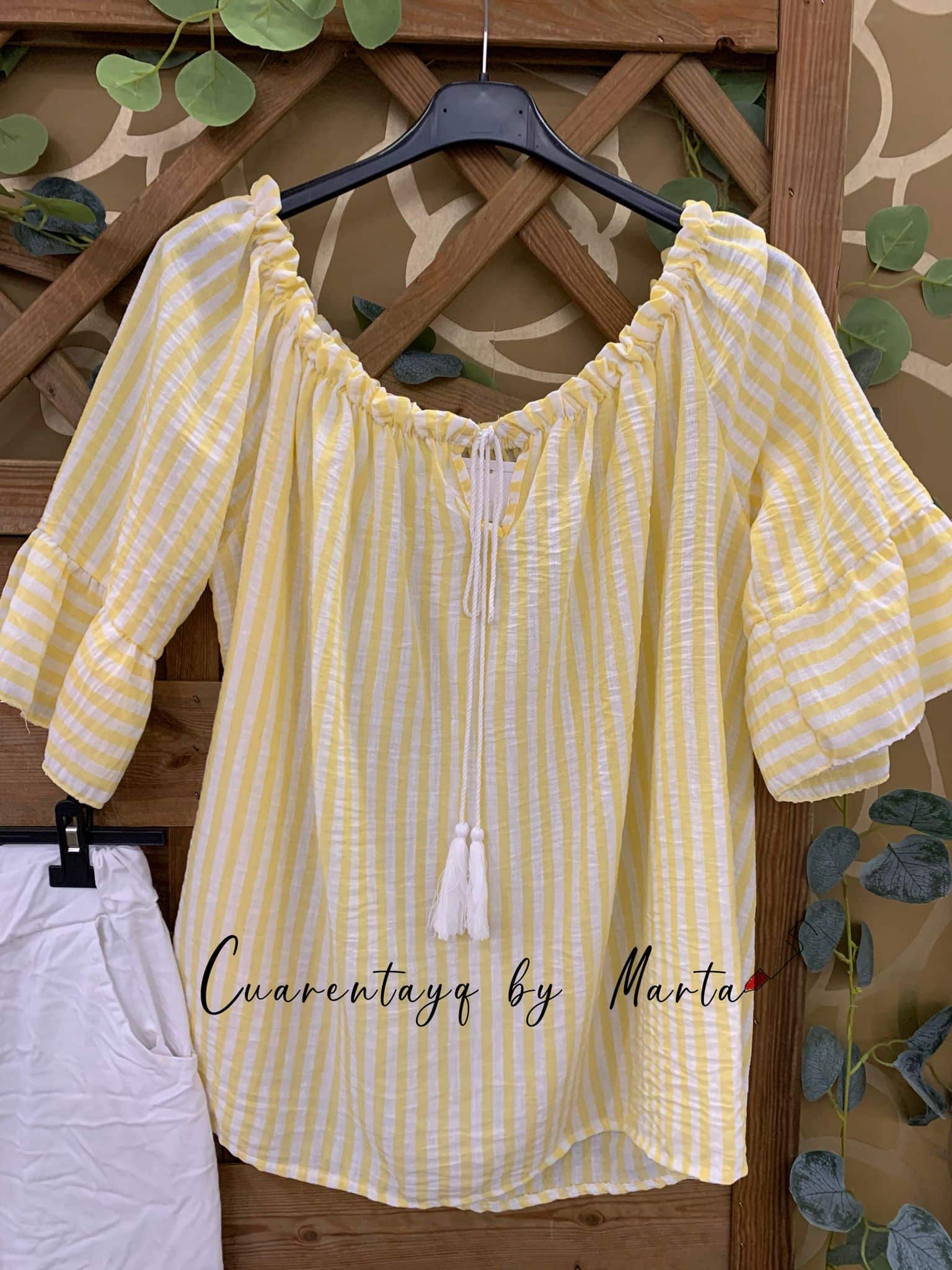 De escote barca con goma fruncida y detalle de cordón para anudar.