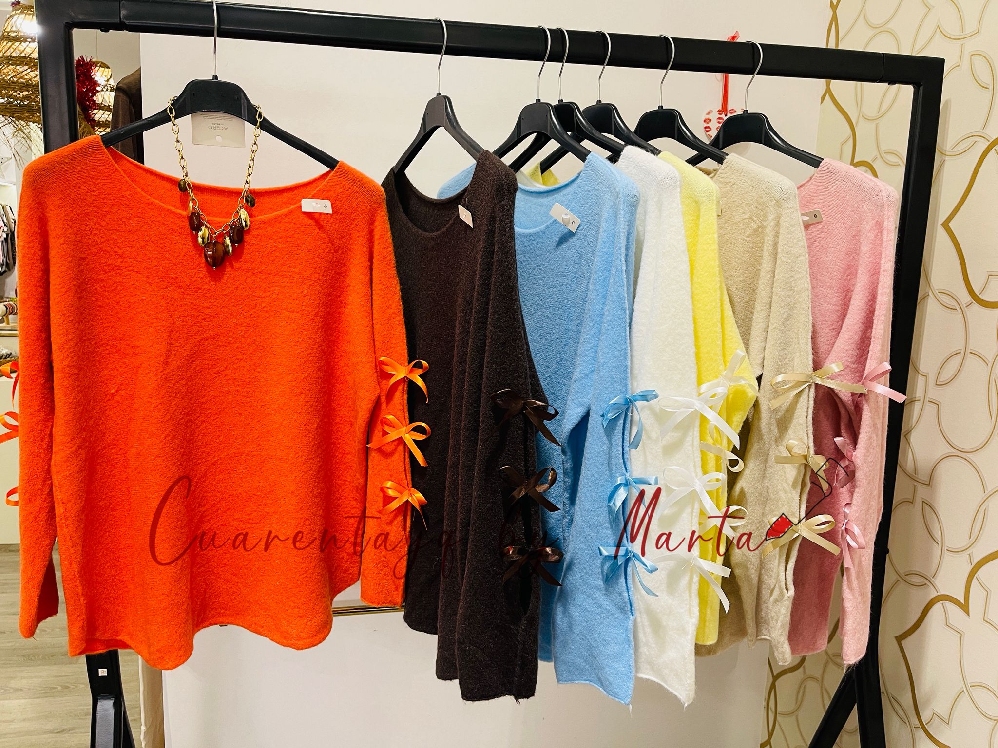 De cuello redondo, manga efecto murciélago. Con detalles de lazos y dejando entre ellos pequeñas aberturas.