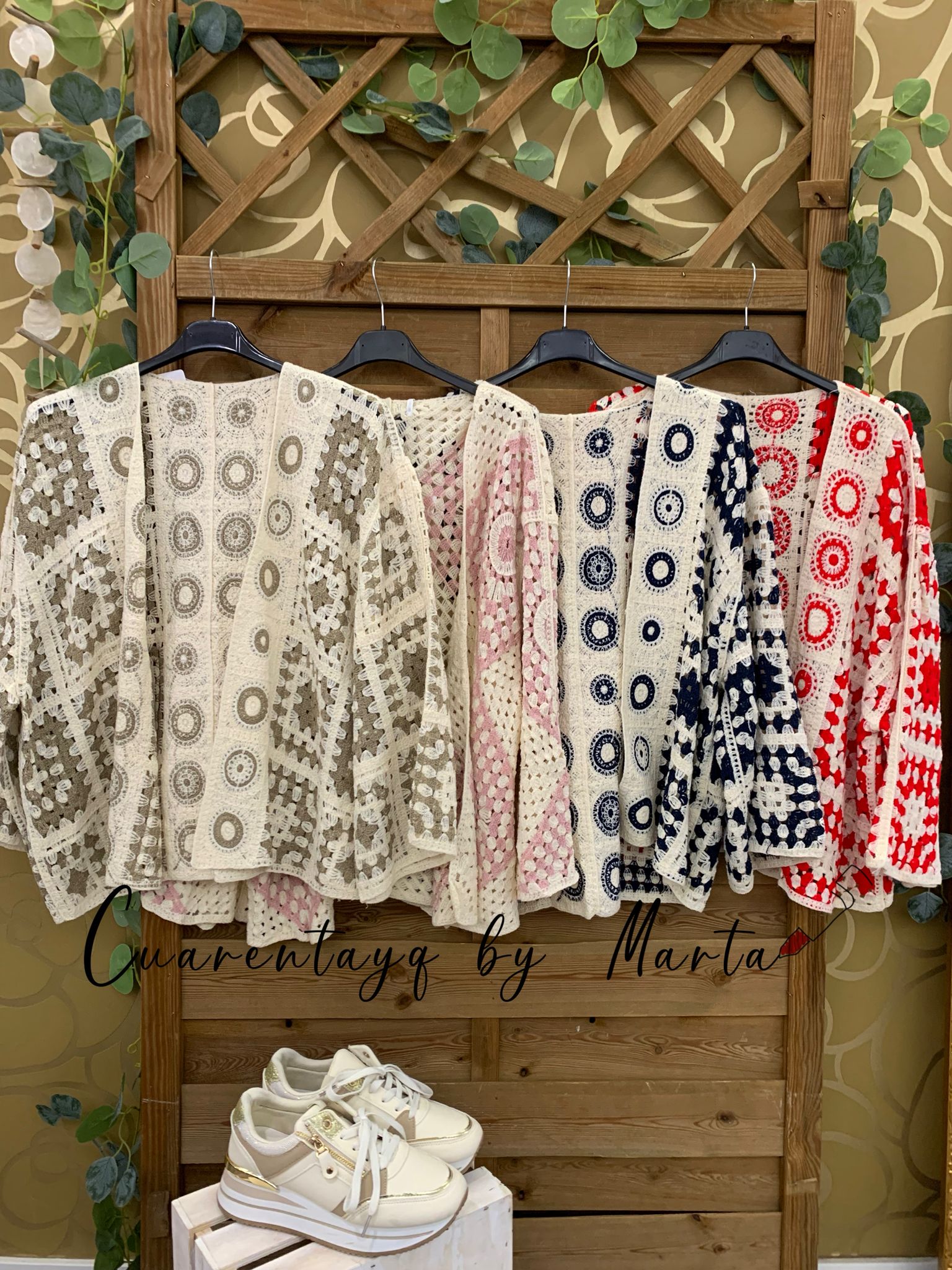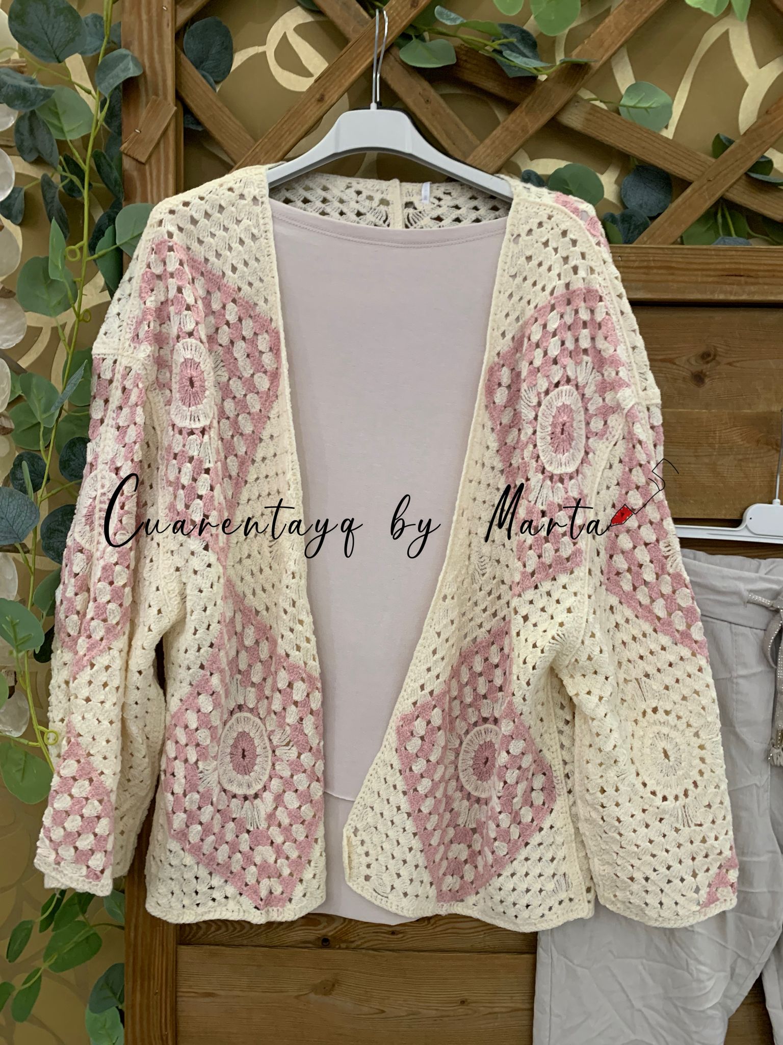Abierto en parte delantera. Tejido todo bordado con detalles de flores.